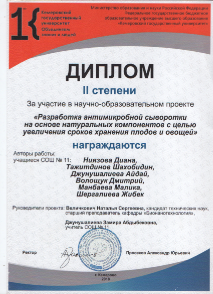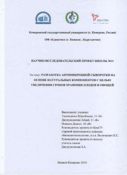 | 2. | «Разработка антимикробной сыворотки на основе натуральных компонентов с целью увеличиния сроков хранения плодов и овощей» | Кемеровский Государственный Университет Кандидат технических наук, старший преподаватель кафедры «Бионанотехнология» Величкович Н.С. | Учитель химии СОШ №11 Джунушалиева З.А. | Диплом 2 степени в КГУ.