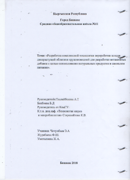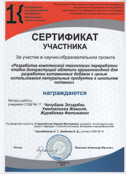 | 1. | «Разработка комплексной технологии переработки плодов дикорастущей облепихи крушиновидной для разработки витаминных добавок с целью использования натуральных продуктов в школьном питании» | Кемеровский Государственный Университет Кандидат технических наук, доцент кафедры «Технология жиров, биохимия и микробиология» Старовойтова К.В. | Учитель информатики СОШ №11 Таалайбекова А.Т. | Сертификат участника В КГУ. 5 место в городском конкурсе исследовательских проектов в номинации: «Биоэкология. Биоразнообразие природы». | 2018 |